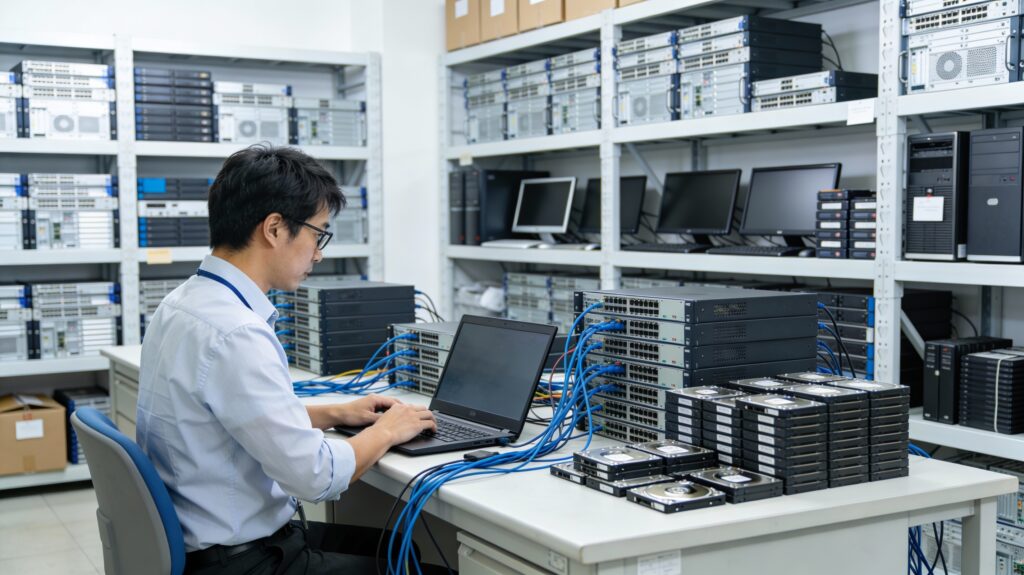 ネットワーク機器やサーバーに精通したエンジニアが、どの機器にどのようなデータが残りうるかを理解したうえで、適切な消去・初期化方法を選択します。